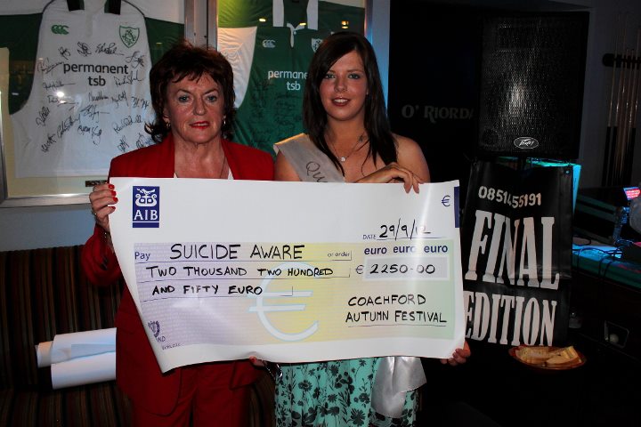 Pat Behan from Suicide Aware accepting a cheque from Coachford Autumn Festival Queen, Kellie Browne.